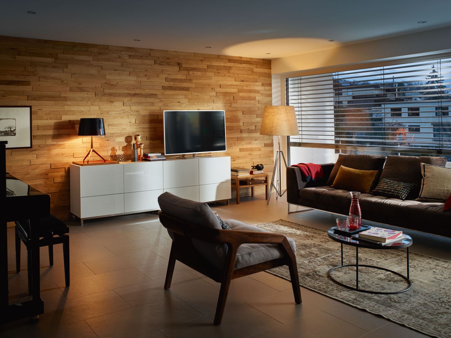 - Moderne Architektur setzt häufig auf große Glasflächen, Sichtbeton oder metallische Elemente. Diese Materialien lassen viele Gestaltungsmöglichkeiten zu, wirken jedoch eher nüchtern. Wandpaneele aus Holz bringen Wärme und Behaglichkeit in den Wohnraum und ergänzen die vorhandenen Materialien.